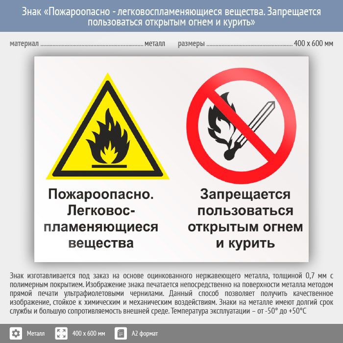 Знак «Пожароопасно - легковоспламеняющиеся вещества. Запрещается пользоваться открытым огнем и курить», КЗ-70 (металл, 600х400 мм) в Черкесске купить