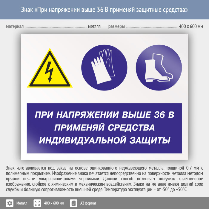Знак «При напряжении выше 36 В применяй защитные средства», КЗ-71 (металл, 600х400 мм) в Черкесске купить