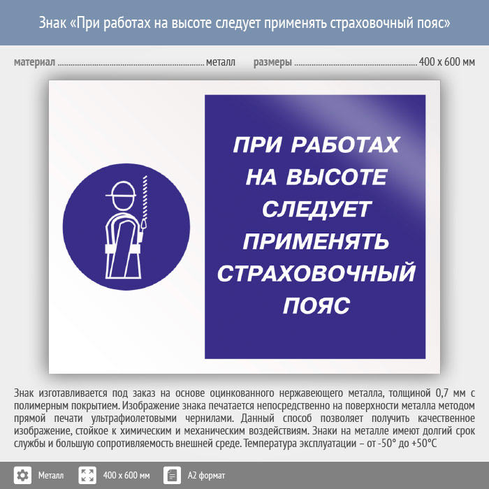 Знак «При работах на высоте следует применять страховочный пояс», КЗ-75 (металл, 600х400 мм) в Черкесске купить