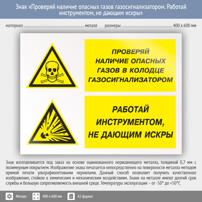 Знак «Проверяй наличие опасных газов газосигнализатором. Работай инструментом, не дающим искры», КЗ-77 (металл, 600х400 мм) в Черкесске купить