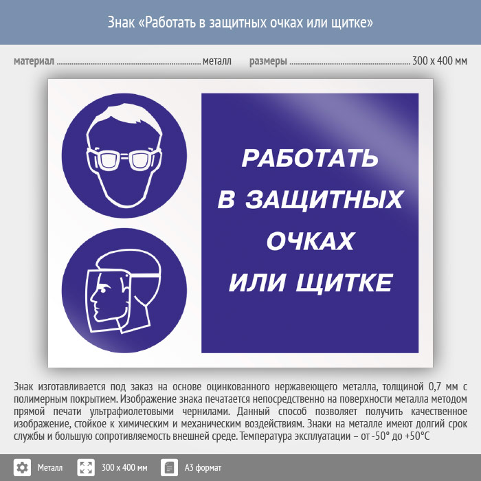 Знак «Работать в защитных очках или щитке», КЗ-80 (металл, 400х300 мм) в Черкесске купить
