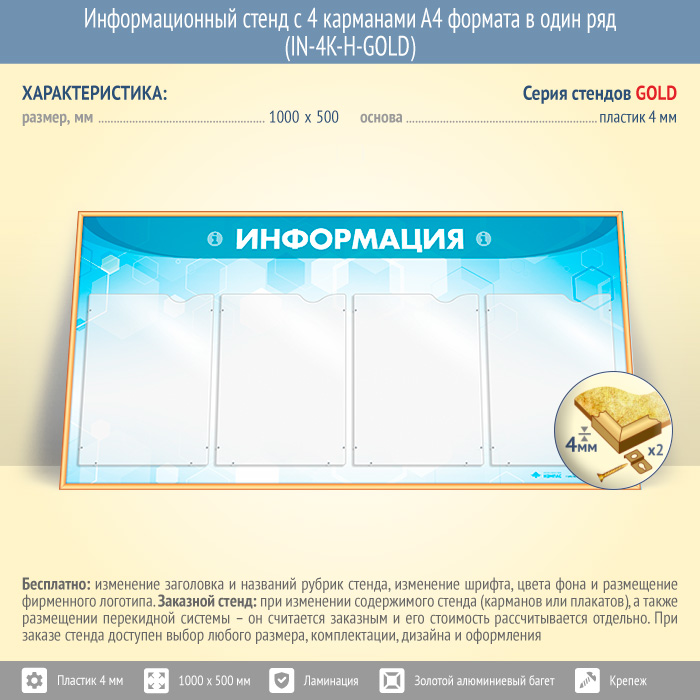 Информационный стенд с 4 карманами А4 формата в один ряд (IN-4K-H-GOLD) в Черкесске купить