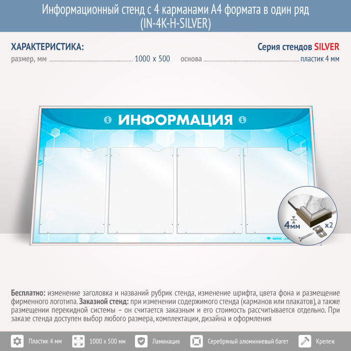 Информационный стенд с 4 карманами А4 формата в один ряд (IN-4K-H-SILVER) в Черкесске купить