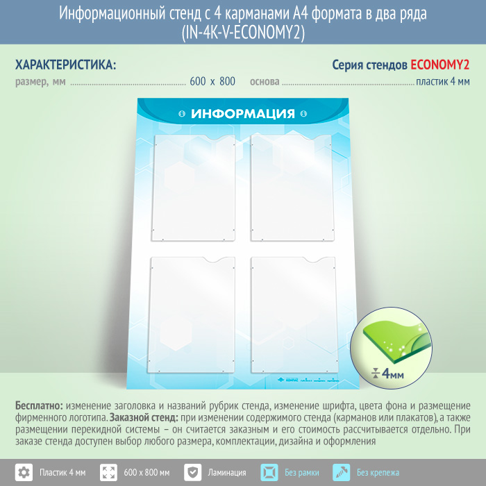 Информационный стенд с 4 карманами А4 формата в два ряда (IN-4K-V-ECONOMY2) в Черкесске купить