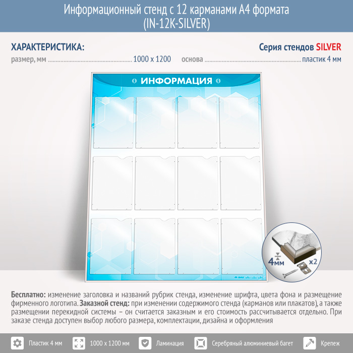 Информационный стенд с 12 карманами А4 формата (IN-12K-SILVER) в Черкесске купить