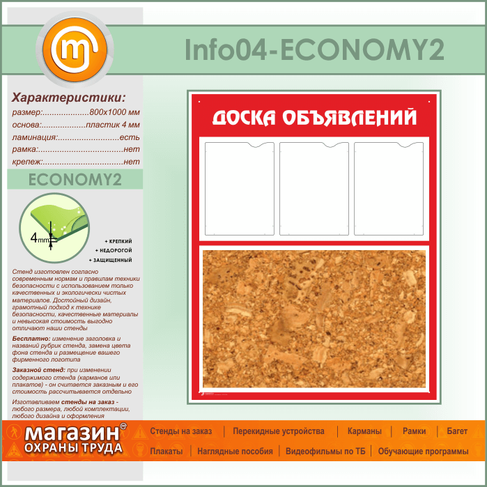 Стенд «Доска объявлений» с пробковым полотном и 3 карманами А4 формата (IN-04-ECONOMY2) в Черкесске купить