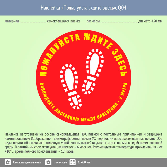 Наклейка на пол «Пожалуйста, ждите здесь», Q04 (пленка c ламинированием, диаметр 450 мм) в Черкесске купить