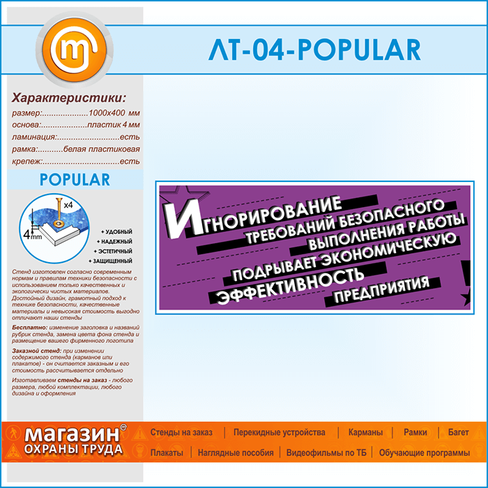 Предлагаем Вашему вниманию стенд с лозунгом «Игнорирование требований безопасного выполнения работы подрывает экономическую эффективность предприятия»