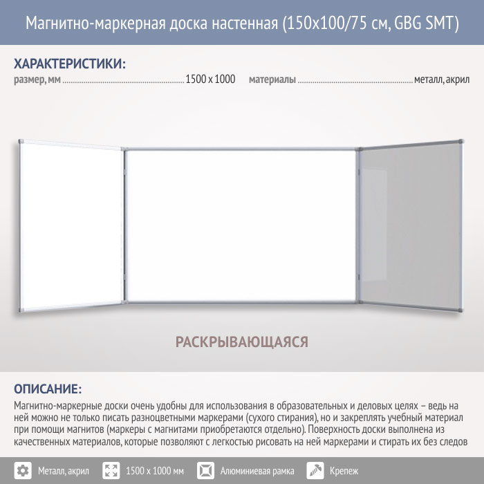 Магнитно-маркерная доска настенная (150x100/75 см, GBG SMT) в Черкесске купить
