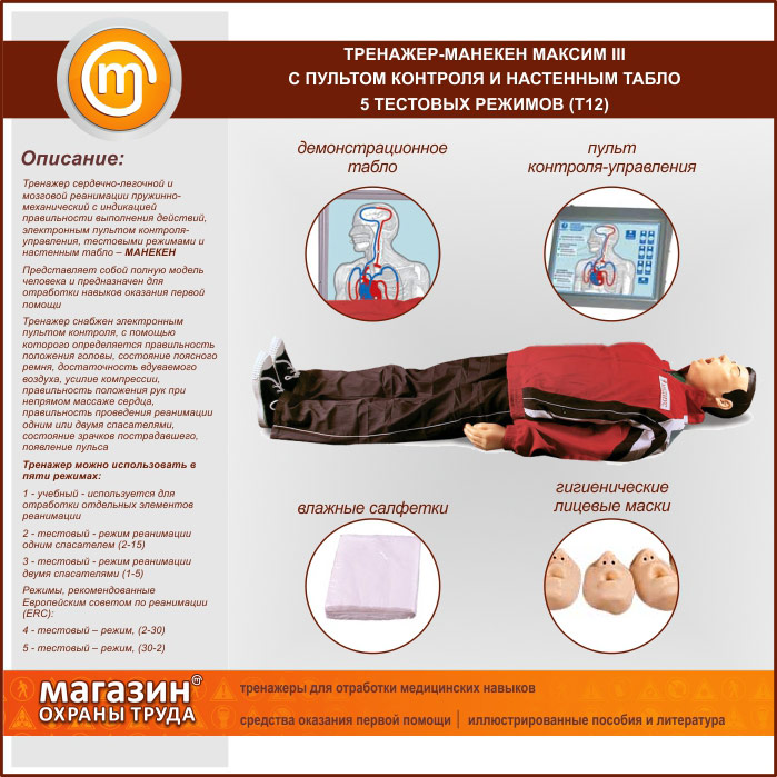 Тренажер-манекен «Максим» III с пультом контроля и управления и настенным табло (Т12.2) | Тренажер-манекен «Максим» III с пультом контроля и управления и настенным табло (Т12.2) |