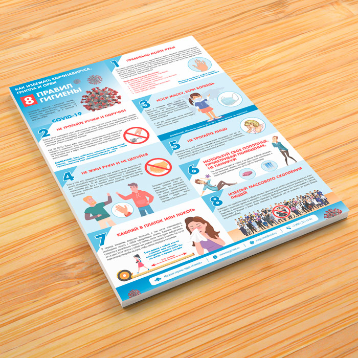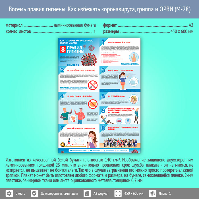 Плакат «Восемь правил гигиены. Как избежать коронавируса, гриппа и ОРВИ» (М-28, ламинированная бумага, А2, 1 лист) в Черкесске купить