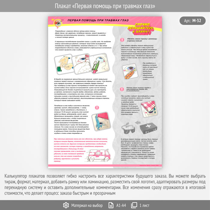 Плакат «Первая помощь при травмах глаз» (М-32, 1 лист) в Черкесске купить