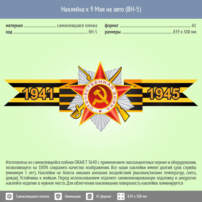 Наклейка к 9 Мая на авто А4 формата (BH-5)