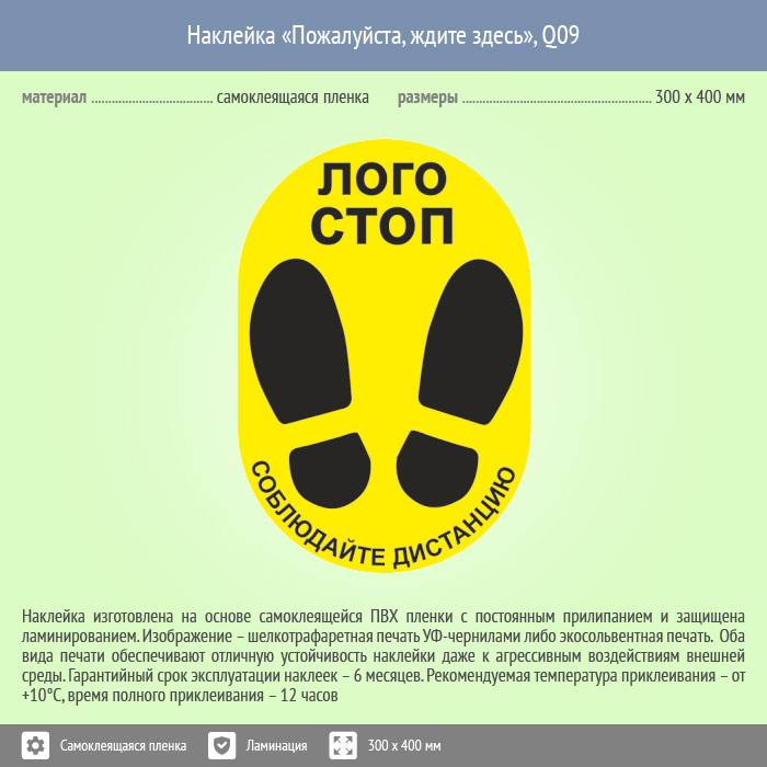 Наклейка на пол «Пожалуйста, ждите здесь», Q09 используется на время карантина для напоминания о необходимости соблюдения дистанции. Согласно постановлению главы Роспотребнадзора Анны Поповой от 1 апреля, все жители России должны соблюдать дистанцию и не подходить друг к другу ближе чем на один метр. В сообщении говорится, что ограничения не распространяются на поездки в легковых такси