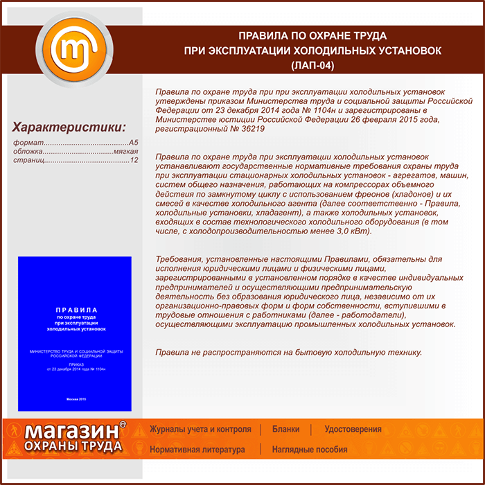 Правила по охране труда при эксплуатации холодильных установок (Приказ Минтруда РФ от 23.12.2014 №1104н) (ЛАП-04) в Черкесске купить