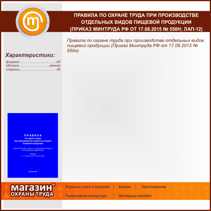 Правила по охране труда при производстве отдельных видов пищевой продукции (Приказ Минтруда РФ от 17.08.2015 № 550н) (ЛАП-12) в Черкесске купить