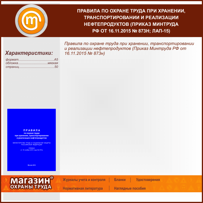 Правила по охране труда при хранении, транспортировании и реализации нефтепродуктов (Приказ Минтруда РФ от 16.11.2015 № 873н) (ЛАП-15) в Черкесске купить
