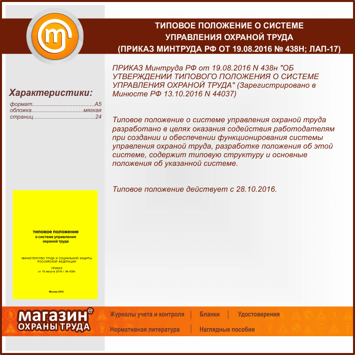 Типовое положение о системе управления охраной труда (Приказ Минтруда РФ от 19.08.2016 № 438н) (ЛАП-17) в Черкесске купить
