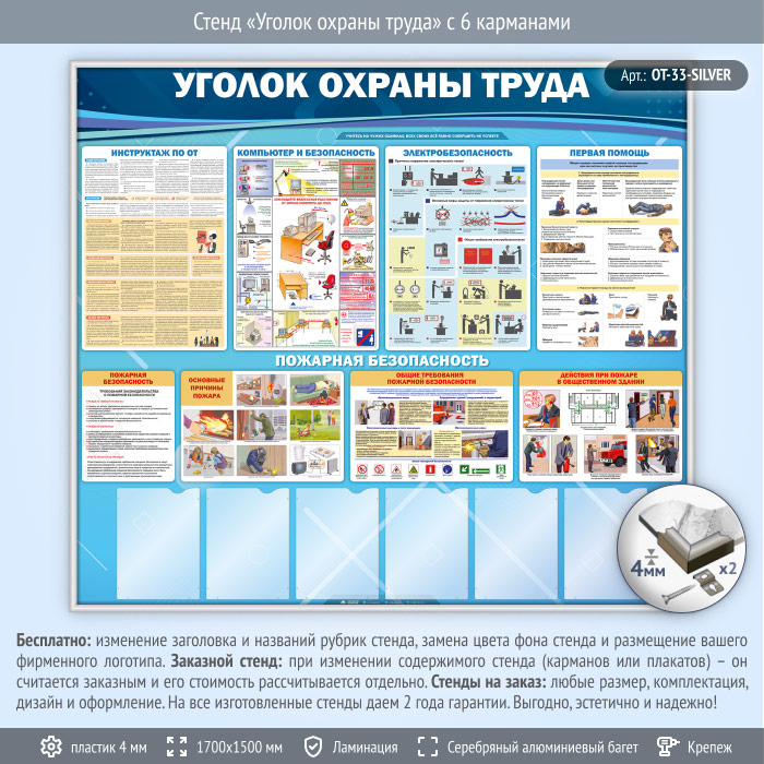 Стенд «Уголок охраны труда» с 6 карманами (OT-33-SILVER) в Черкесске купить