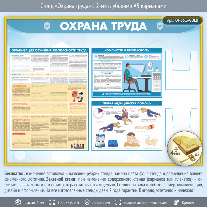 Стенд «Охрана труда» с 2-мя глубокими А5 карманами (OT-35.3-GOLD) в Черкесске купить