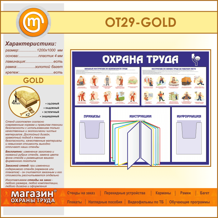 Стенд «Охрана труда» с перекидной системой и 2 объемными карманами (OT-29-GOLD) в Черкесске купить