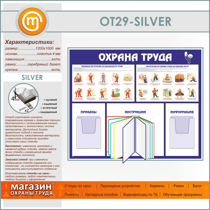 Стенд «Охрана труда» с перекидной системой и 2 объемными карманами (OT-29-SILVER) в Черкесске купить