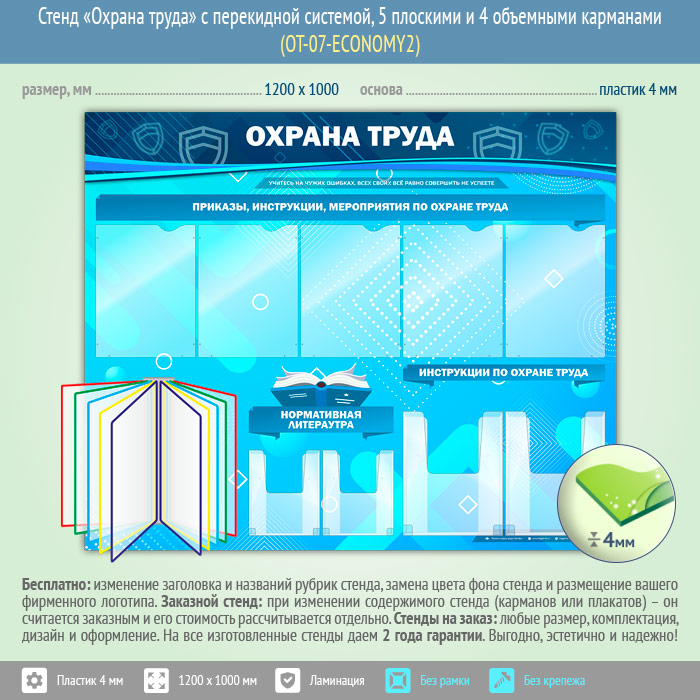 Стенд «Охрана труда» с перекидной системой, 5 плоскими и 4 объемными карманами (OT-07-ECONOMY2) в Черкесске купить