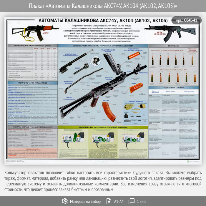 Плакат «Автоматы Калашникова АКС74У, АК104 (АК102, АК105)» (ОБЖ-41, 1 лист) в Черкесске купить