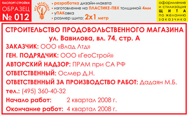 Паспорт стройки, образец № 12 (пластик 4 мм, 2000х1000 cм) в Черкесске купить