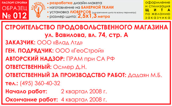 Паспорт стройки, образец № 12 (баннерная ткань, 2500х1300 cм) в Черкесске купить