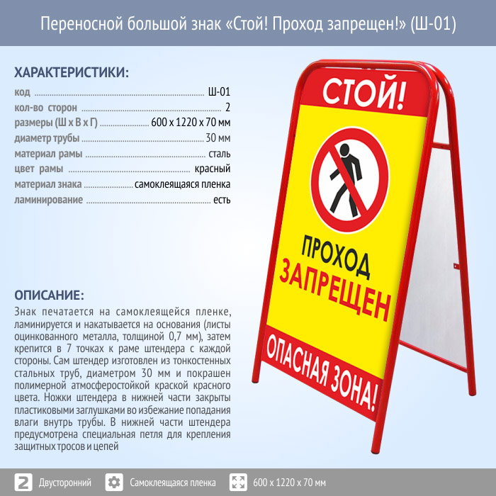 Переносной большой знак «Стой! Проход запрещен!» (Ш-01, двусторонний, самоклеящаяся пленка) в Черкесске купить