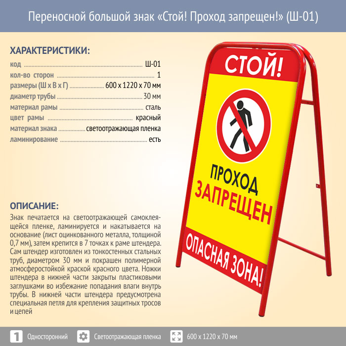 Переносной большой знак «Стой! Проход запрещен!» (Ш-01, односторонний, светоотражающая пленка) в Черкесске купить