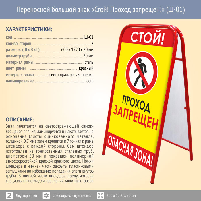 Переносной большой знак «Стой! Проход запрещен!» (Ш-01, двусторонний, светоотражающая пленка) в Черкесске купить