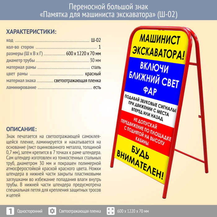 Переносной большой знак «Памятка для машиниста экскаватора» (Ш-02, односторонний, светоотражающая пленка) в Черкесске купить
