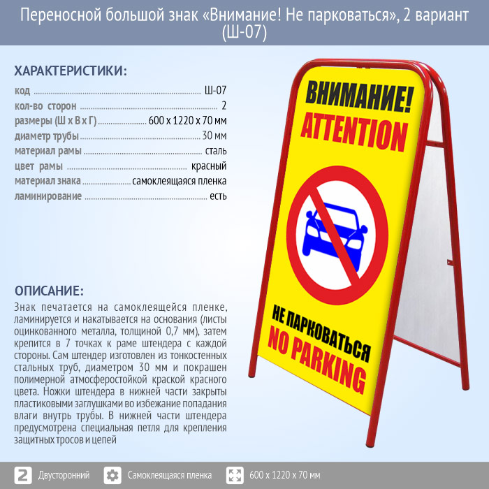 Переносной большой знак «Внимание! Не парковаться», 2 вариант (Ш-07, двусторонний, самоклеящаяся пленка) в Черкесске купить