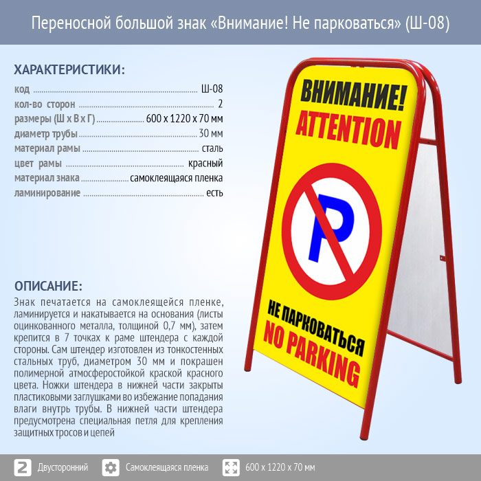 Переносной большой знак «Внимание! Не парковаться» (Ш-08, двусторонний, самоклеящаяся пленка) в Черкесске купить