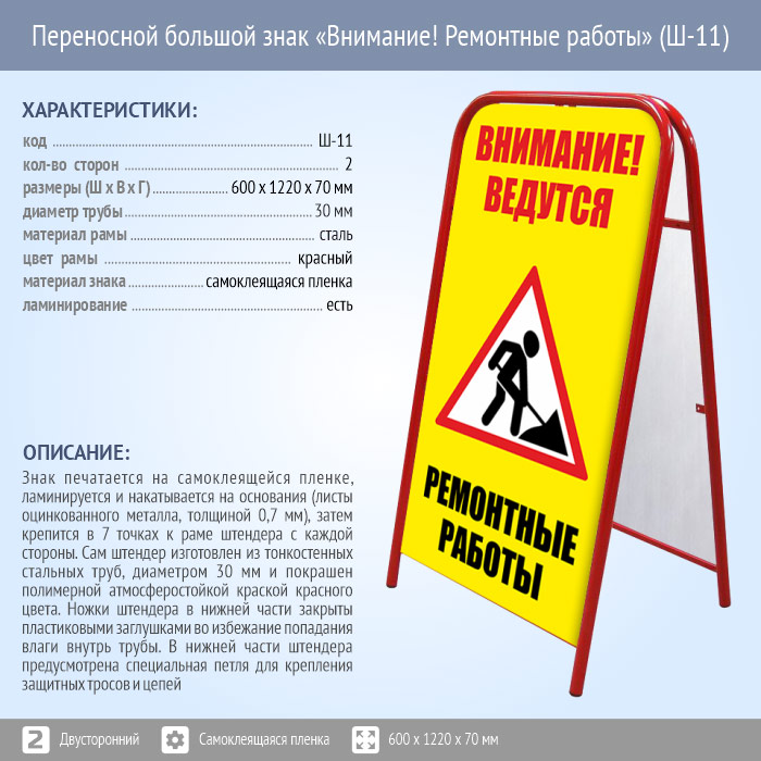 Переносной большой знак «Внимание! Ремонтные работы» (Ш-11, двусторонний, самоклеящаяся пленка) в Черкесске купить