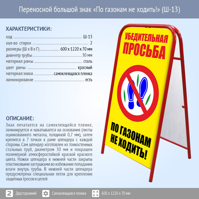 Переносной большой знак «По газонам не ходить!» (Ш-13, двусторонний, самоклеящаяся пленка) в Черкесске купить