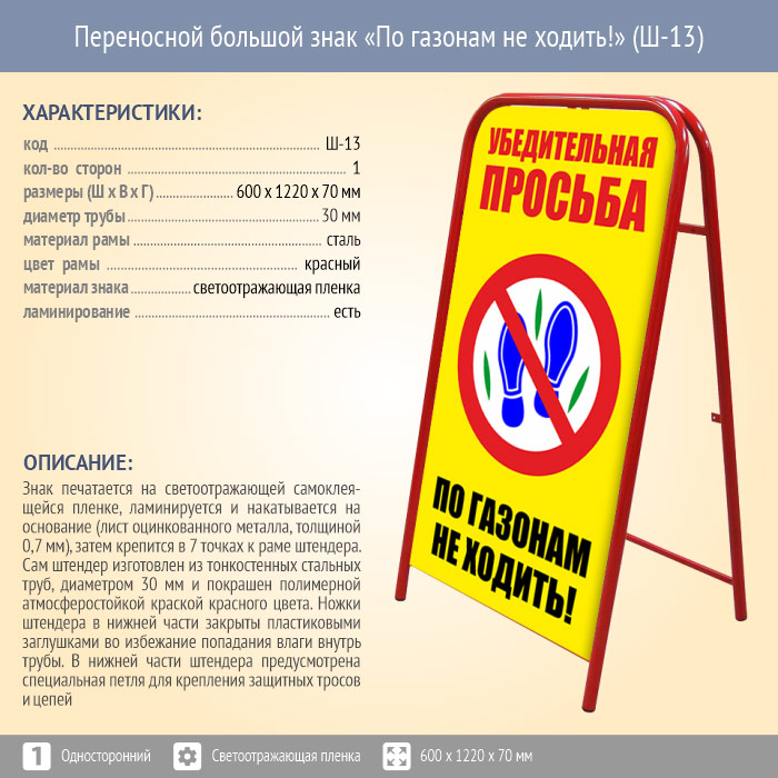 Переносной большой знак «По газонам не ходить!» (Ш-13, односторонний, светоотражающая пленка) в Черкесске купить