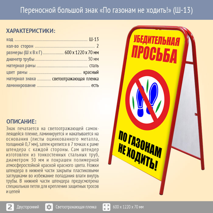 Переносной большой знак «По газонам не ходить!» (Ш-13, двусторонний, светоотражающая пленка) в Черкесске купить