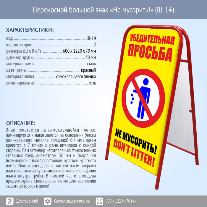 Переносной большой знак «Не мусорить!» (Ш-14, двусторонний, самоклеящаяся пленка) в Черкесске купить