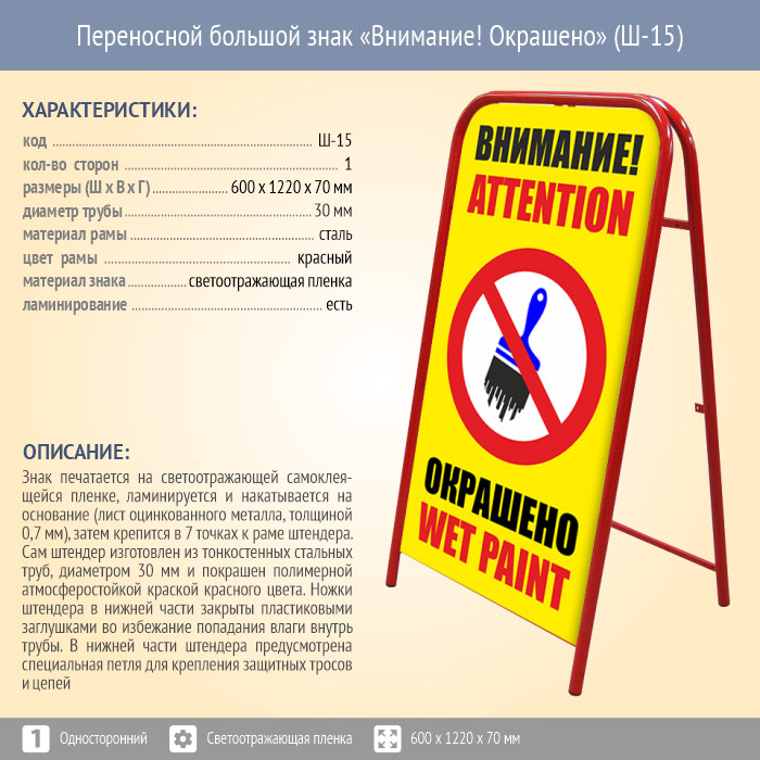Переносной большой знак «Внимание! Окрашено» (Ш-15, односторонний, светоотражающая пленка) в Черкесске купить