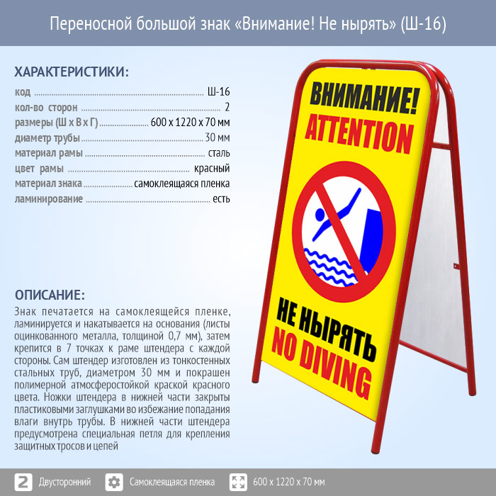 Переносной большой знак «Внимание! Не нырять» (Ш-16, двусторонний, самоклеящаяся пленка) в Черкесске купить