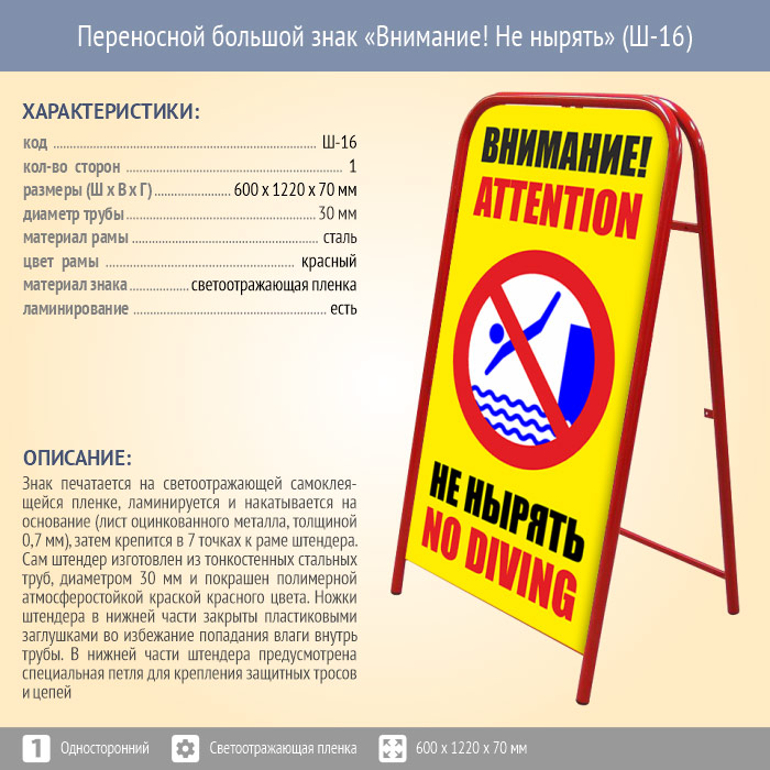 Переносной большой знак «Внимание! Не нырять» (Ш-16, односторонний, светоотражающая пленка) в Черкесске купить