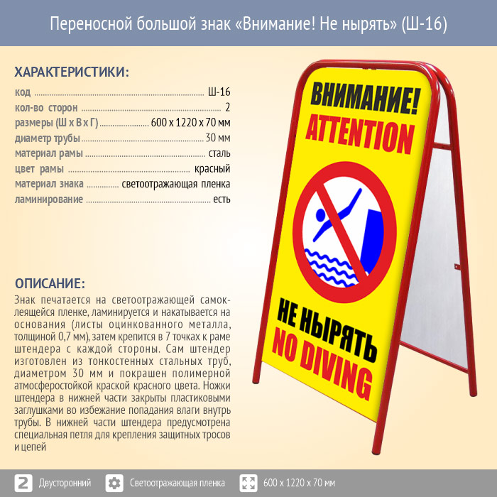 Переносной большой знак «Внимание! Не нырять» (Ш-16, двусторонний, светоотражающая пленка) в Черкесске купить