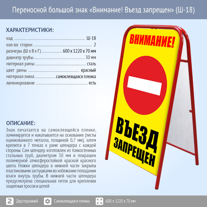 Переносной большой знак «Внимание! Въезд запрещен» (Ш-18, двусторонний, самоклеящаяся пленка) в Черкесске купить