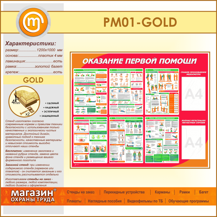 Стенд «Оказание первой помощи» с плоским и объемным карманами (PM-01-GOLD) в Черкесске купить