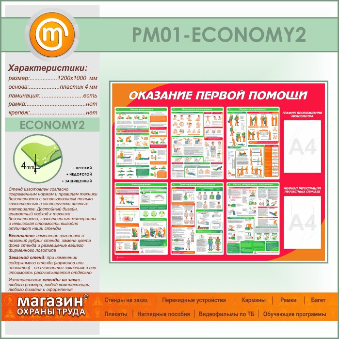 Стенд «Оказание первой помощи» с плоским и объемным карманами (PM-01-ECONOMY2) в Черкесске купить