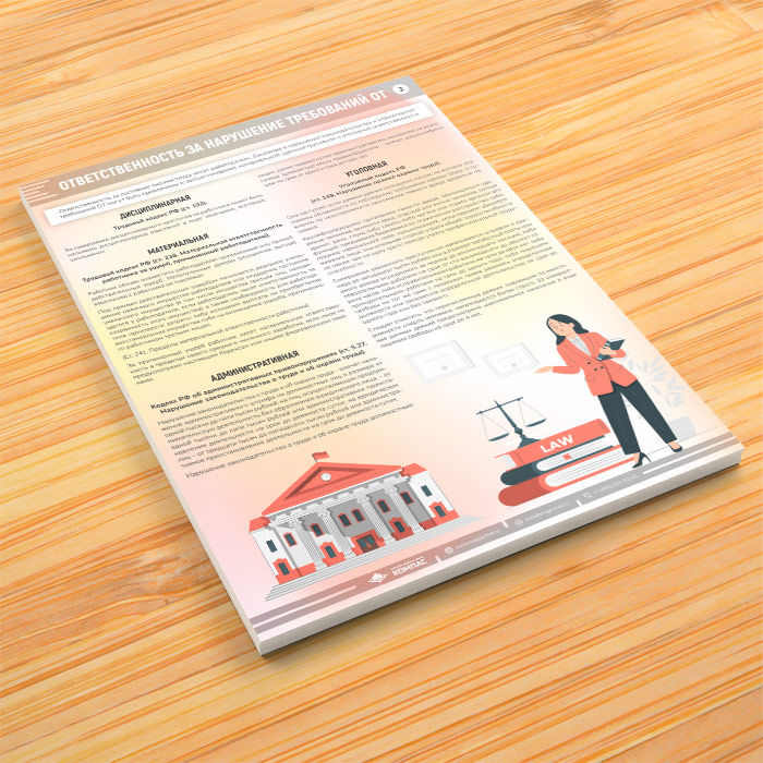 - Плакат «Ответственность за нарушение требований охраны труда» – дисциплинарная, материальная, административная и уголовная ответственность