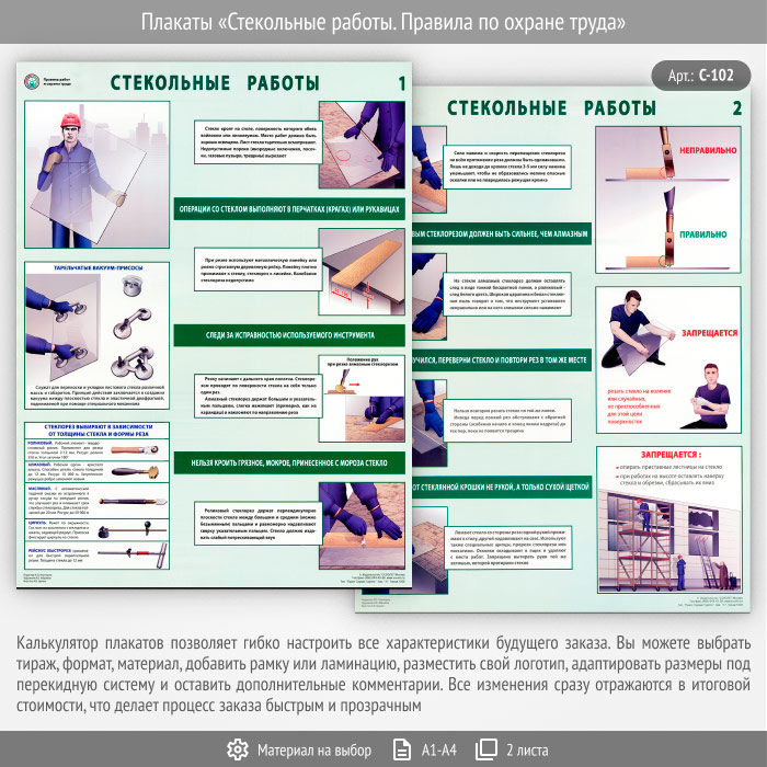 Плакаты «Стекольные работы. Правила по охране труда» (С-102, ламинир. бумага, А2, 2 листа)